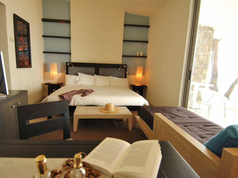 Entdecken Sie im Club oder in den Bungalows neu gestaltete Suiten. Sie sind geräumig, verfügen über einen abgetrennten Salon-Bereich mit raffiniertem Dekor und gehobenem Komfort. Wunderschöner Blick vom Club aus über das Meer und traumhafte Lage der Bungalows im schattigen Pinienhain.